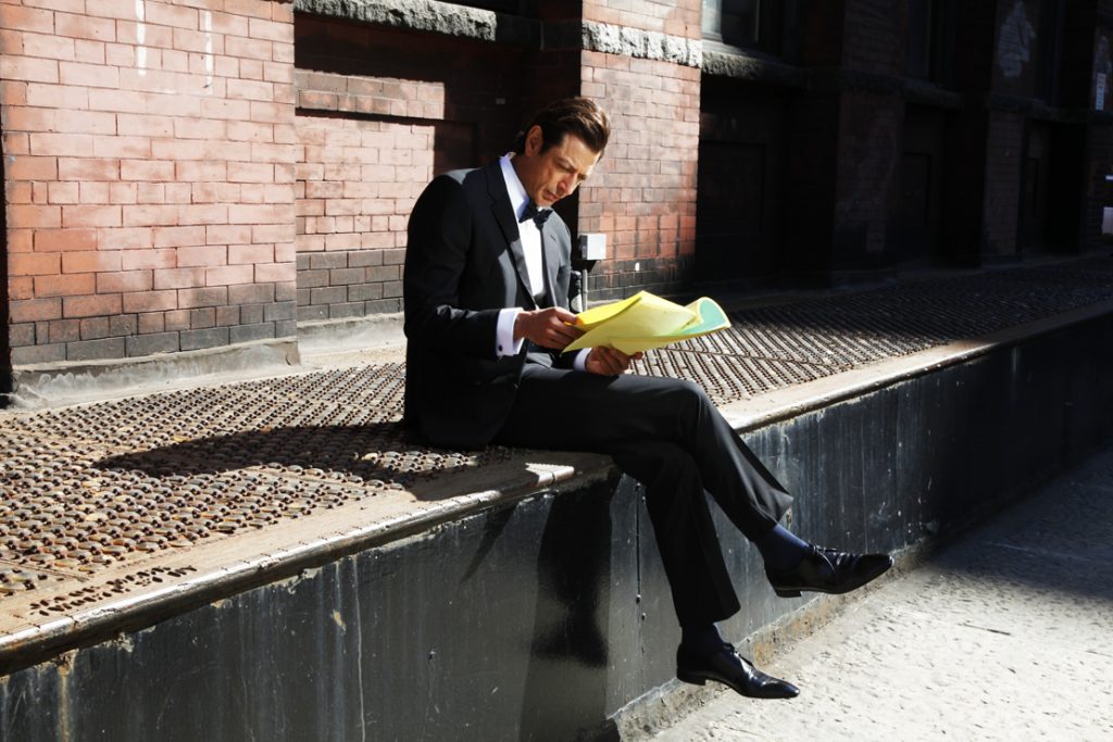 [opposite page] Armani black tuxedo jacket with velvet lapel and black shirt with white collar