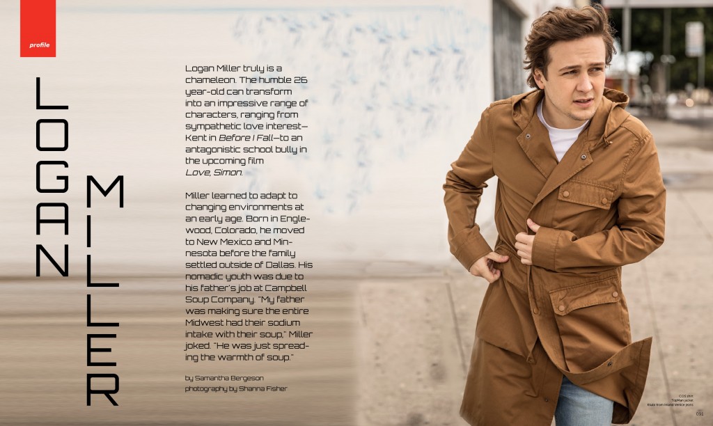 Logan Miller truly is a chameleon. The humble 26 year-old can transform into an impressive range of characters, ranging from sympathetic love interest— Kent in Before I Fall—to an antagonistic school bully in the upcoming film Love, Simon. Miller learned to adapt to changing environments at an early age. Born in Englewood, Colorado, he moved to New Mexico and Minnesota before the family settled outside of Dallas. His nomadic youth was due to his father’s job at Campbell Soup Company. “My father was making sure the entire Midwest had their sodium intake with their soup,” Miller joked. “He was just spreading the warmth of soup.”