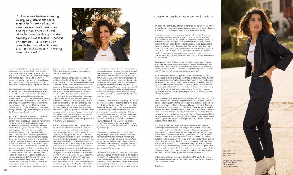 Looking forward, Raymonde has many goals in mind. Her upcoming film about the 1821 war for Greek independence, Cliffs of Freedom, will be released later this year, with the next season of Goliath underway. And of course, there always is Paris in the back of Raymonde’s mind. “Paris is undoubtedly my most favorite city on the planet. There are so many directors in France that I would love to work with. There aren’t many American actors who speak French who want to make movies in France. That’s a big goal of mine. I would even love to do a play in France one day. This is the first time I went with pride as a French citizen and said ‘please, please let this happen,’” she recalled of voting for Macron. “I treated myself to a huge ice cream afterwards.”