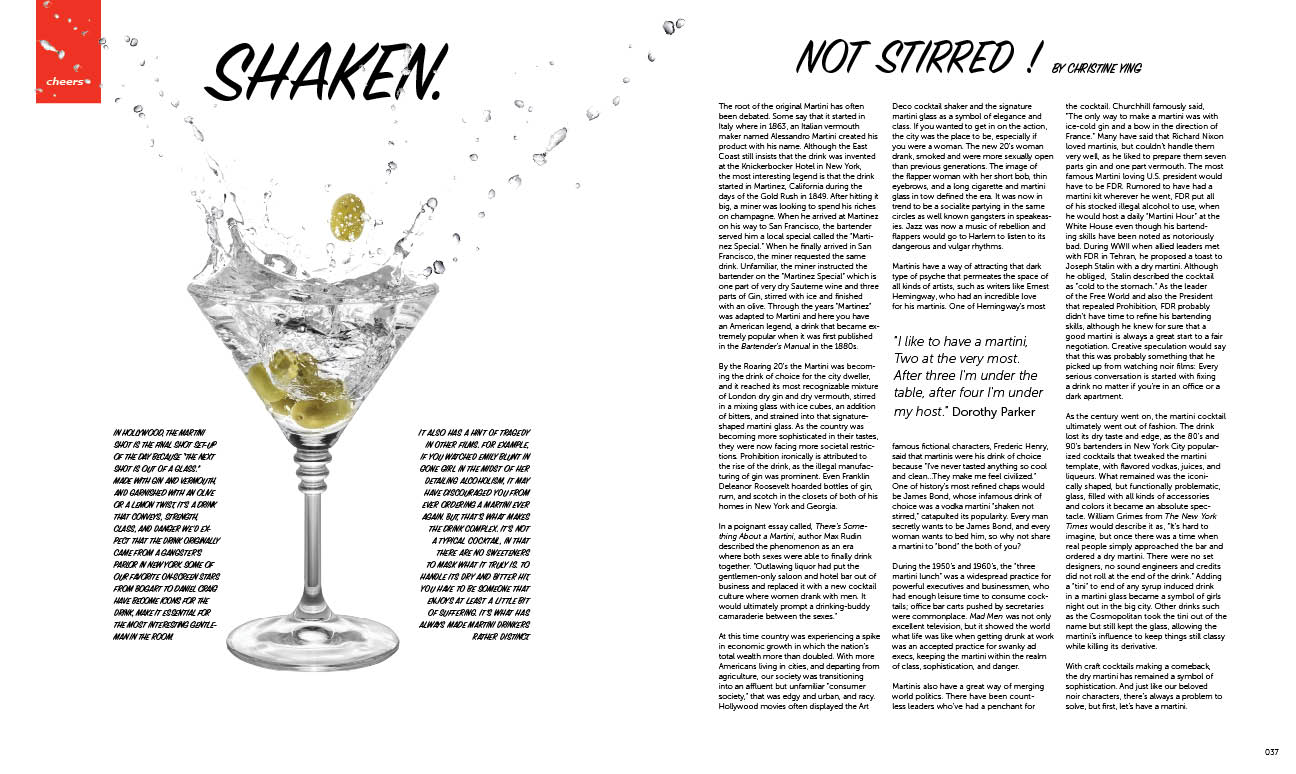 Martinis have a way of attracting that dark type of psyche that permeates the space of all kinds of artists, such as writers like Ernest Hemingway, who had an incredible love for his martinis. One of Hemingway’s most famous fictional characters, Frederic Henry, said that martinis were his drink of choice because “I’ve never tasted anything so cool and clean…They make me feel civilized.” One of history’s most refined chaps would be James Bond, whose infamous drink of choice was a vodka martini “shaken not stirred,” catapulted its popularity. Every man secretly wants to be James Bond, and every woman wants to bed him, so why not share a martini to “bond” the both of you?