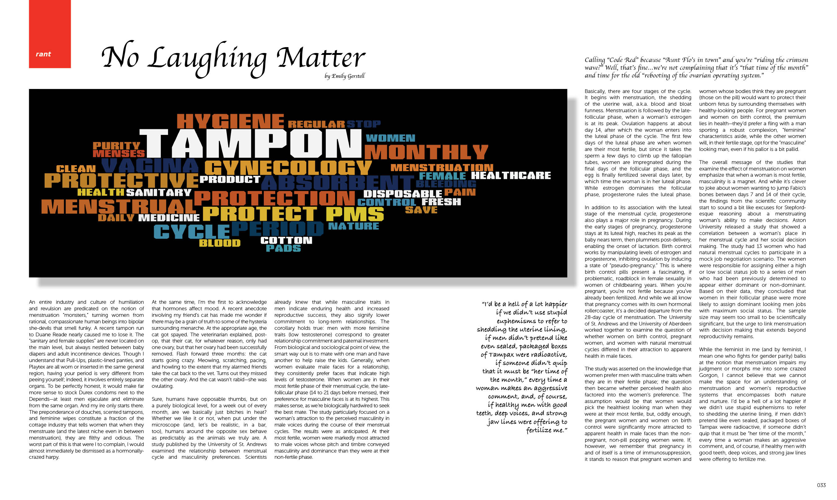 “I’d be a hell of a lot happier if we didn’t use stupid euphemisms to refer to shedding the uterine lining, if men didn’t pretend like even sealed, packaged boxes of Tampax were radioactive, if someone didn’t quip that it must be “her time of the month,” every time a woman makes an aggressive comment, and, of course, if healthy men with good teeth, deep voices, and strong jaw lines were offering to fertilize me.”